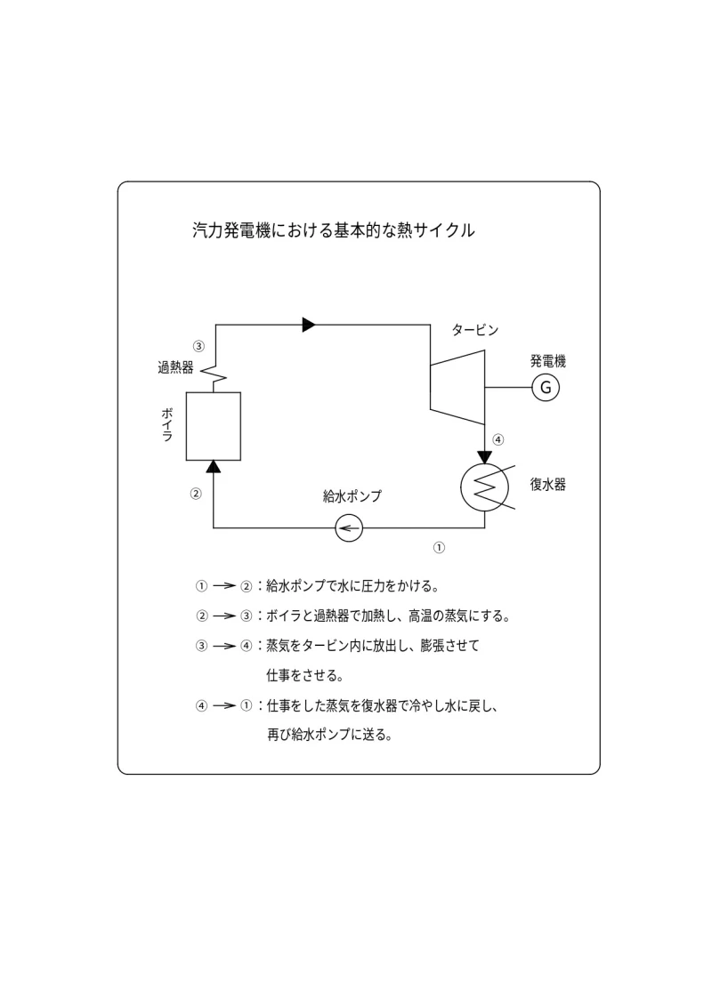 上記のサイクルを実施する事により汽力発電所の熱効率の向上を図ることが出来ます。復水器によるエネルギー損失は熱サイクルの中で最も大きいです。