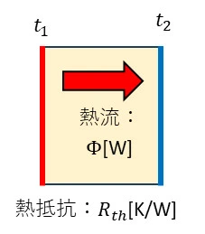 熱抵抗Rth[K/W]の壁を熱流Φ[W]が通過するとき、高温側の温度t1[℃]低温側の温度t2[℃]には、