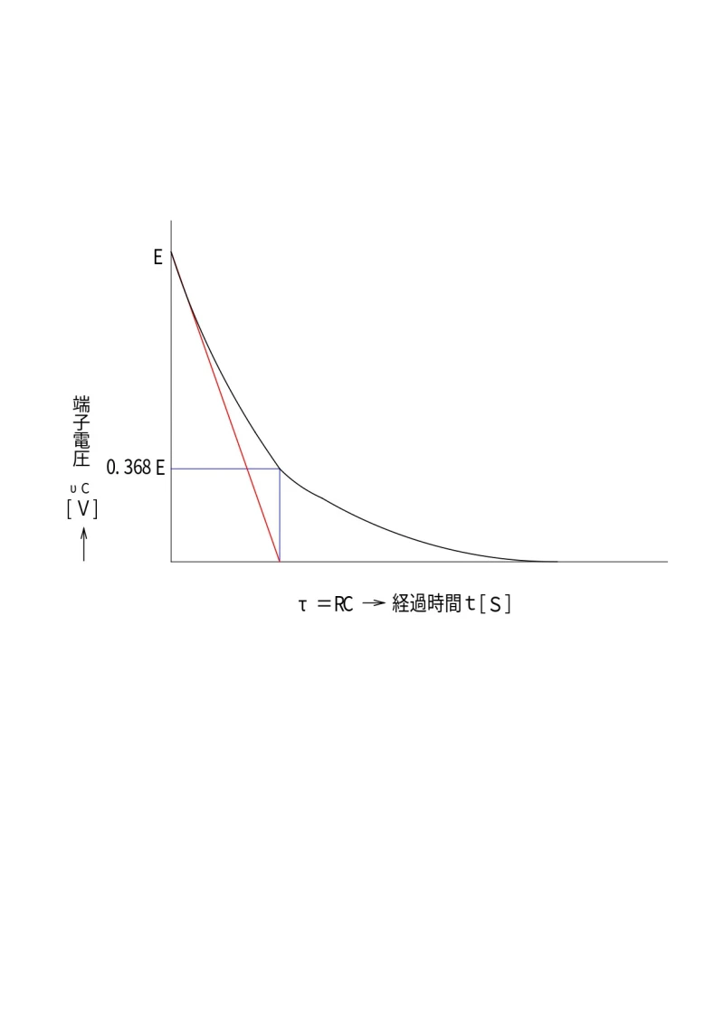 - 時刻t=0sから回路の時定数だけ時間が経過すると、コンデンサの端子電圧vC[V]は直流電源の電圧E[V]の0.368倍に減少する。